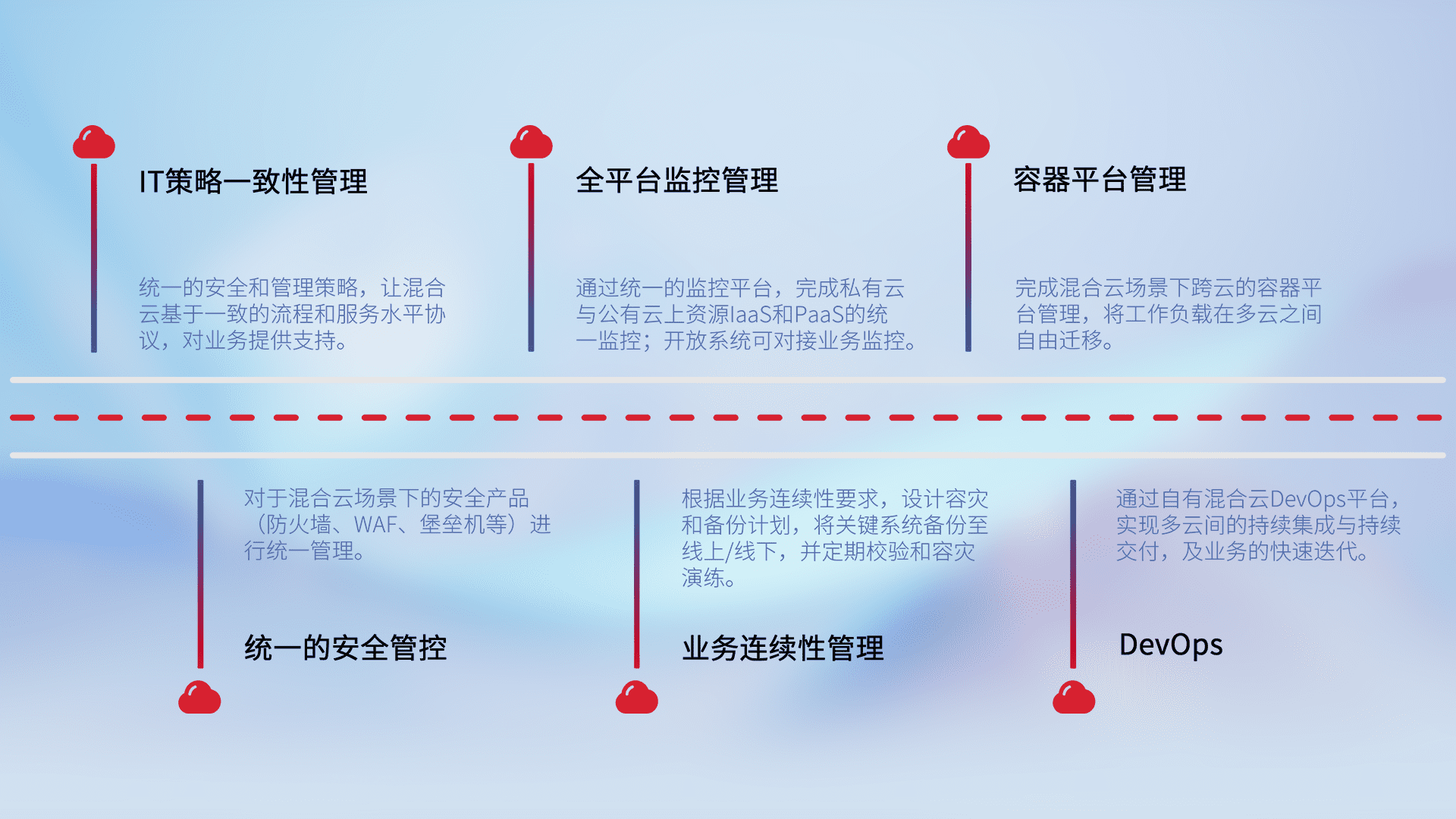 通过多云纳管,,以统一的资源数据模型把客户的云资源进行抽象和封装,,进而实现对多云资源的统一操作,,保障云资源管理的可靠性、、、稳定性与可用性。。。。量身定制化运维内容,,,,配置、、、、开发运维、、、补丁管理、、、备份、、监控、、、认证和访问管理、、审计和日常巡检等,,,保障在用云过程中的可靠度,,,稳定度以及高可用率。。。