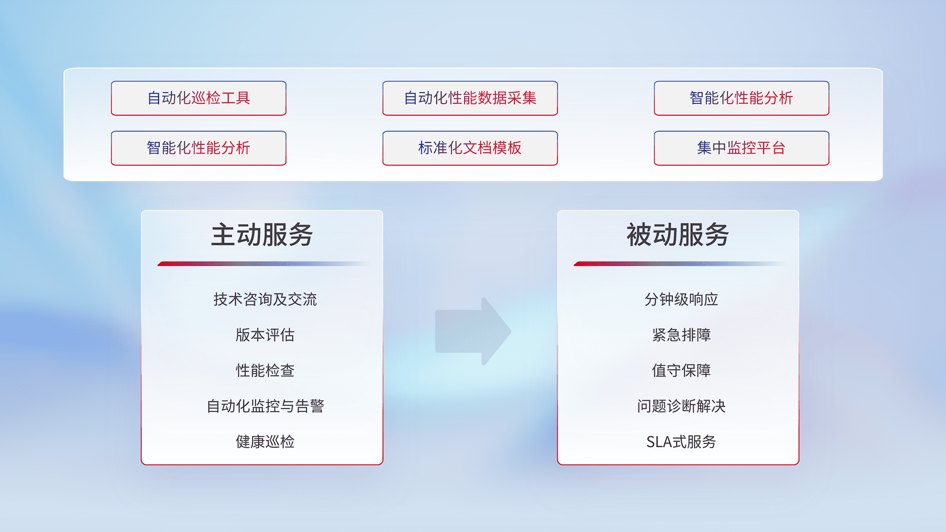 智能化工具和标准化文档,,保障服务质量,,,,提供主动服务(包含技术咨询、、、、版本评估、、性能检查、、、自动化监控与告警、、、、健康巡检)和被动服务包含(分钟级响应、、、、紧急排障、、值守保障、、问题诊断解决、、SLA服务)。。。。