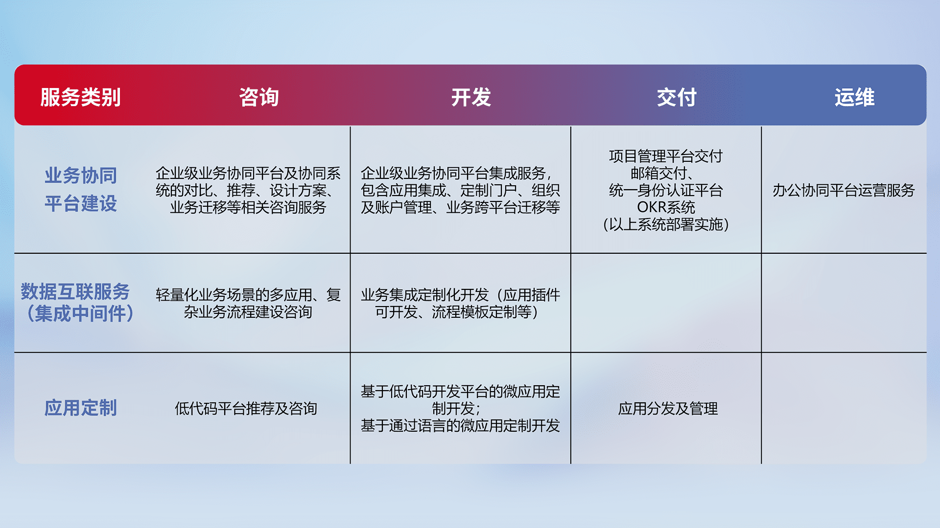 针对钉钉、、企微、、、IDaas等平台级产品提供产品的规划、、方案、、、交付、、定制化开发等服务,,,实现如统一协同办公、、、智能客户服务、、、混合会议管理、、、智能数据查询、、、、等业务场景,,,,实现数字化转型。。。。